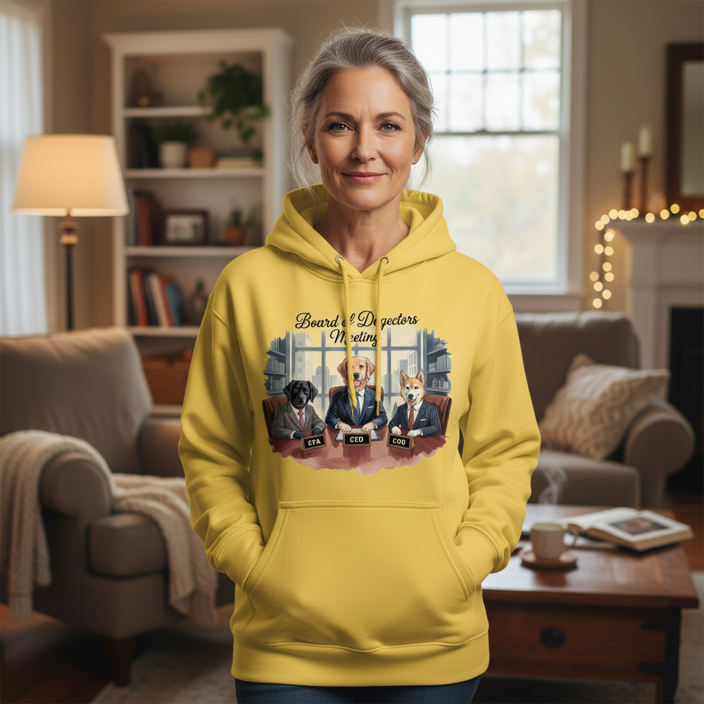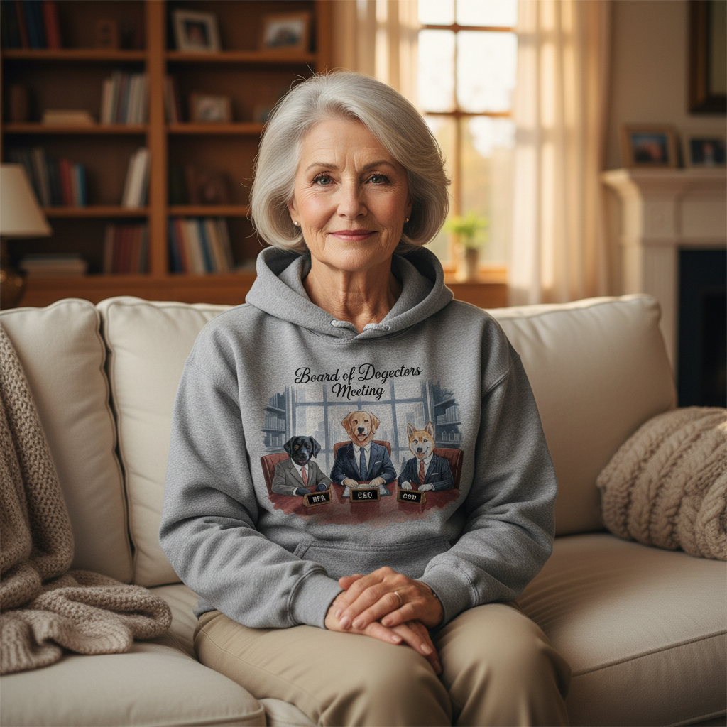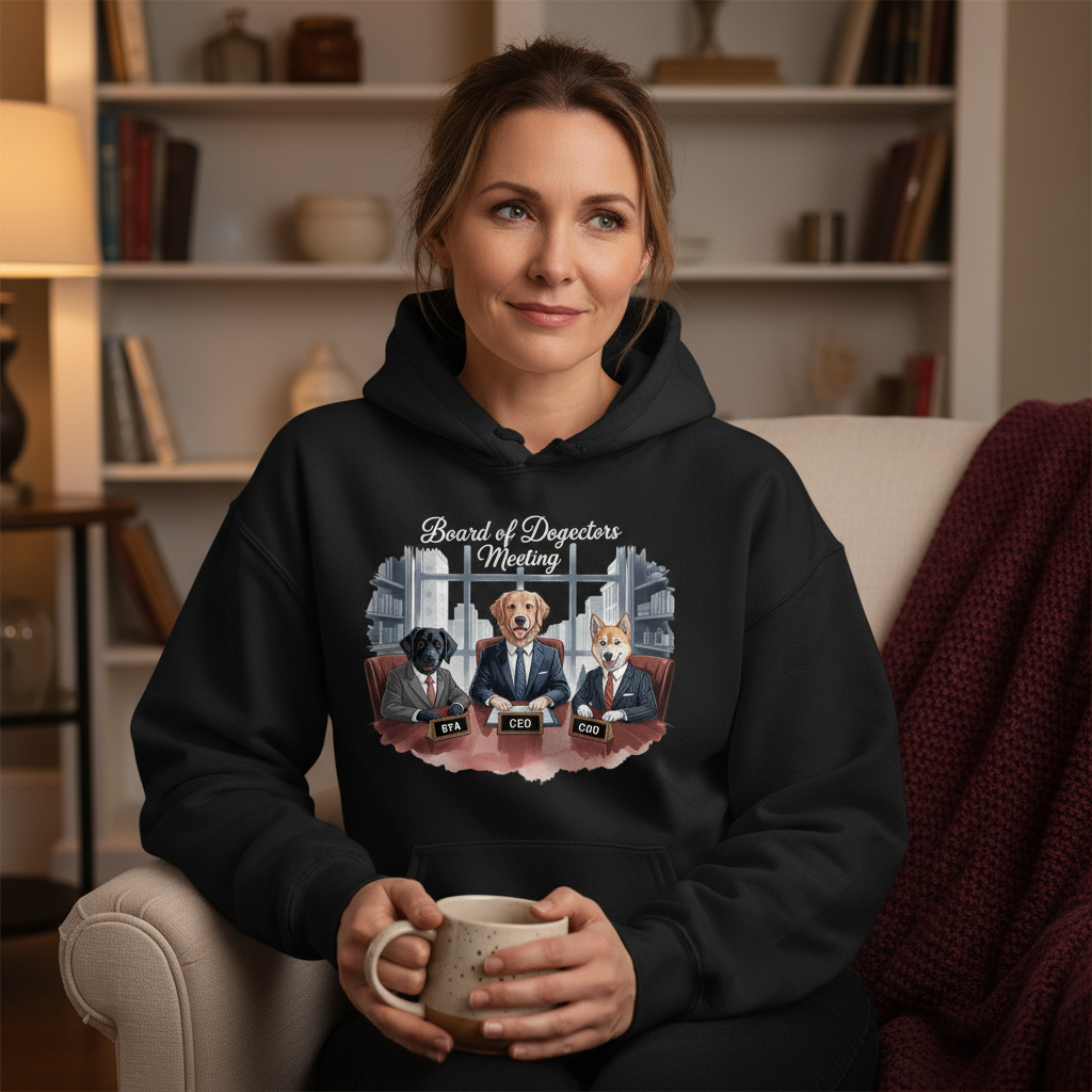Her “Board of Dogectors Meeting” hoodie celebrates the chaos of leading a team that only speaks in tail wags.