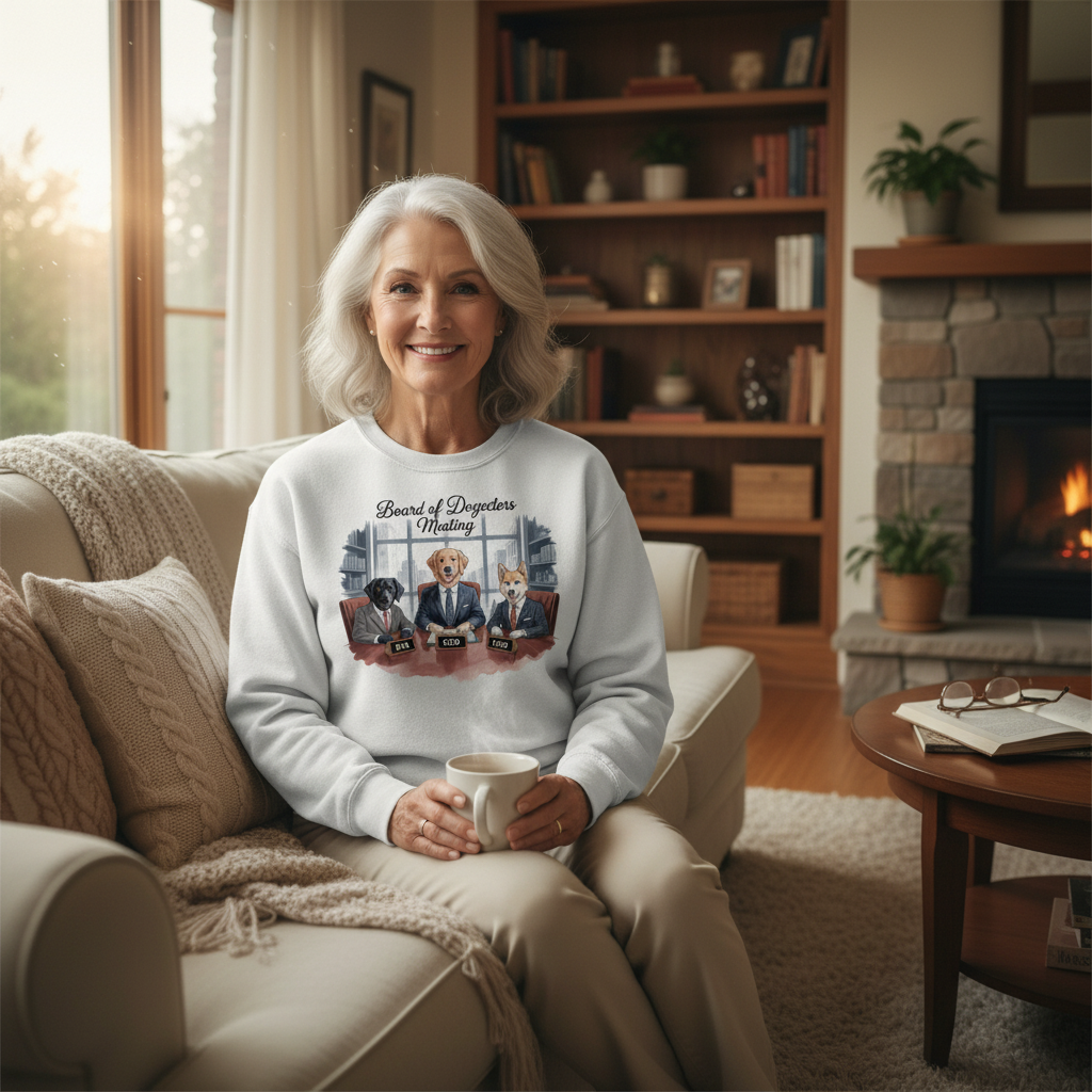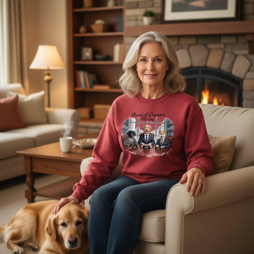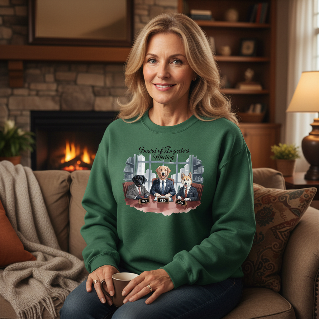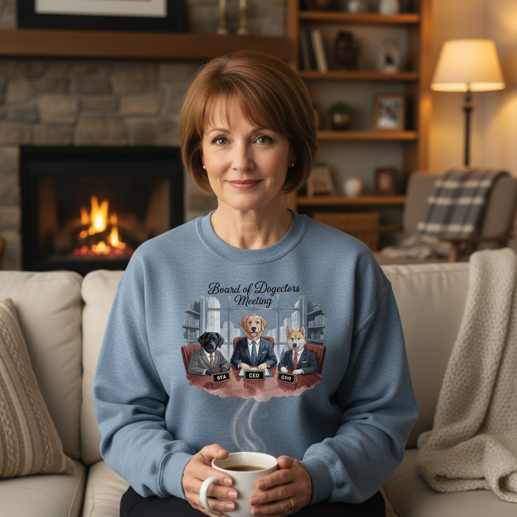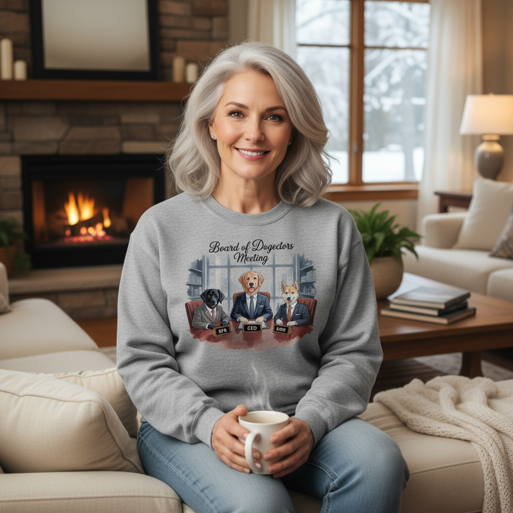 Her “Board of Dogectors Meeting” sweatshirt celebrates the chaos of leading a team that only speaks in tail wags.