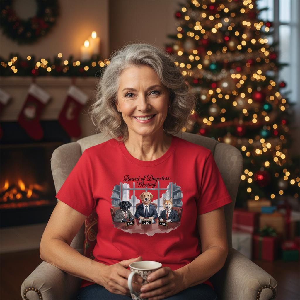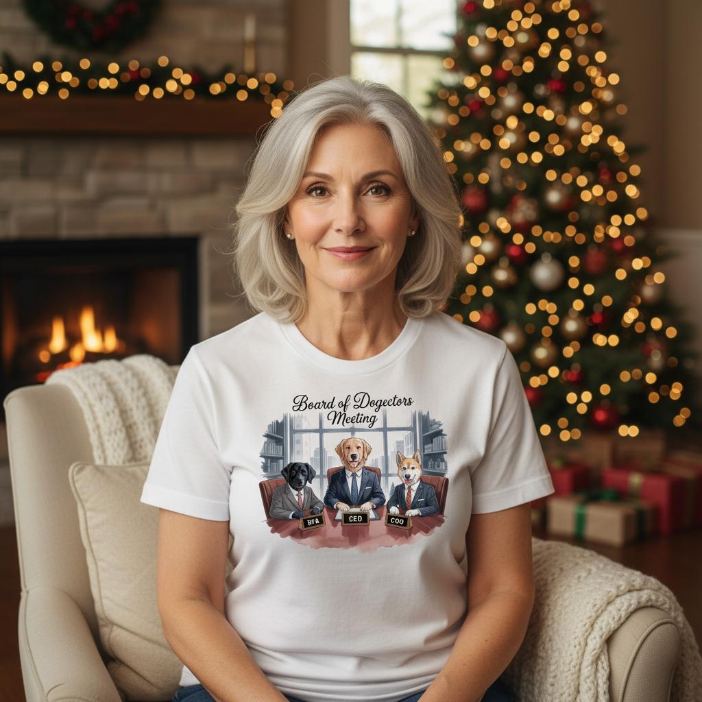 Her “Board of Dogectors Meeting” tee celebrates the chaos of leading a team that only speaks in tail wags.