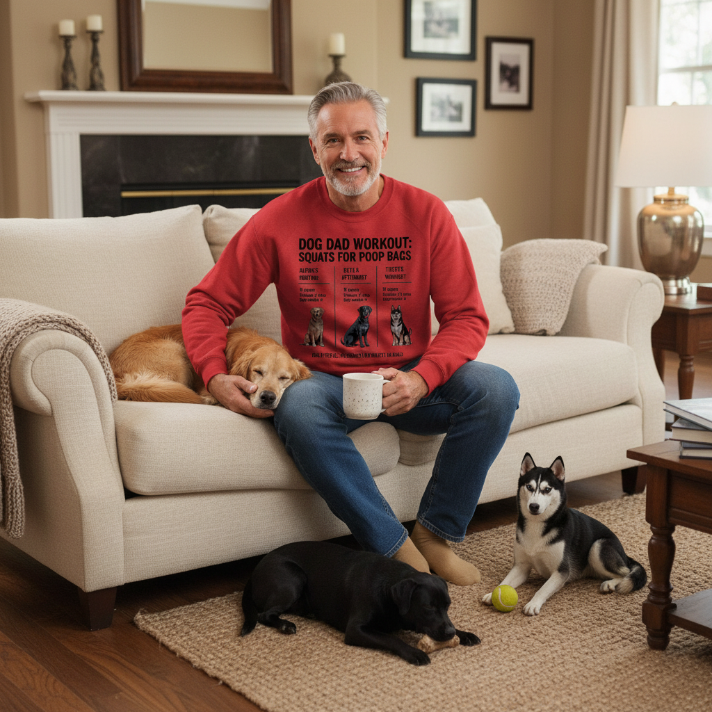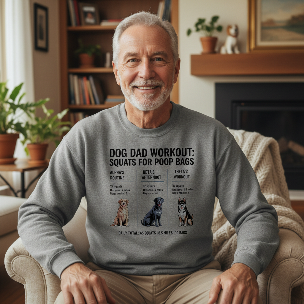 That’s why he wears the Dog Dad Workout: Squat for Poop Bags sweatshirt because fatherhood comes with reps he never expected.