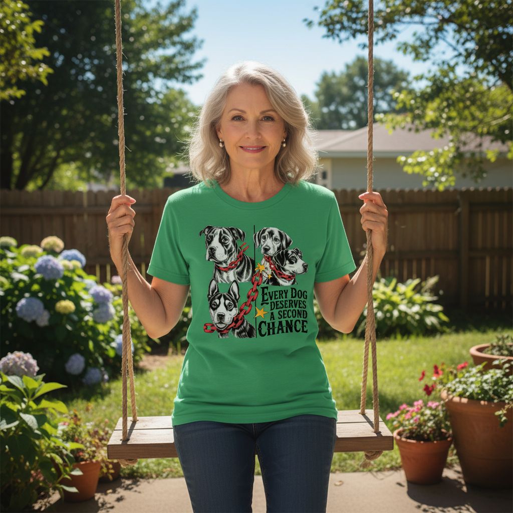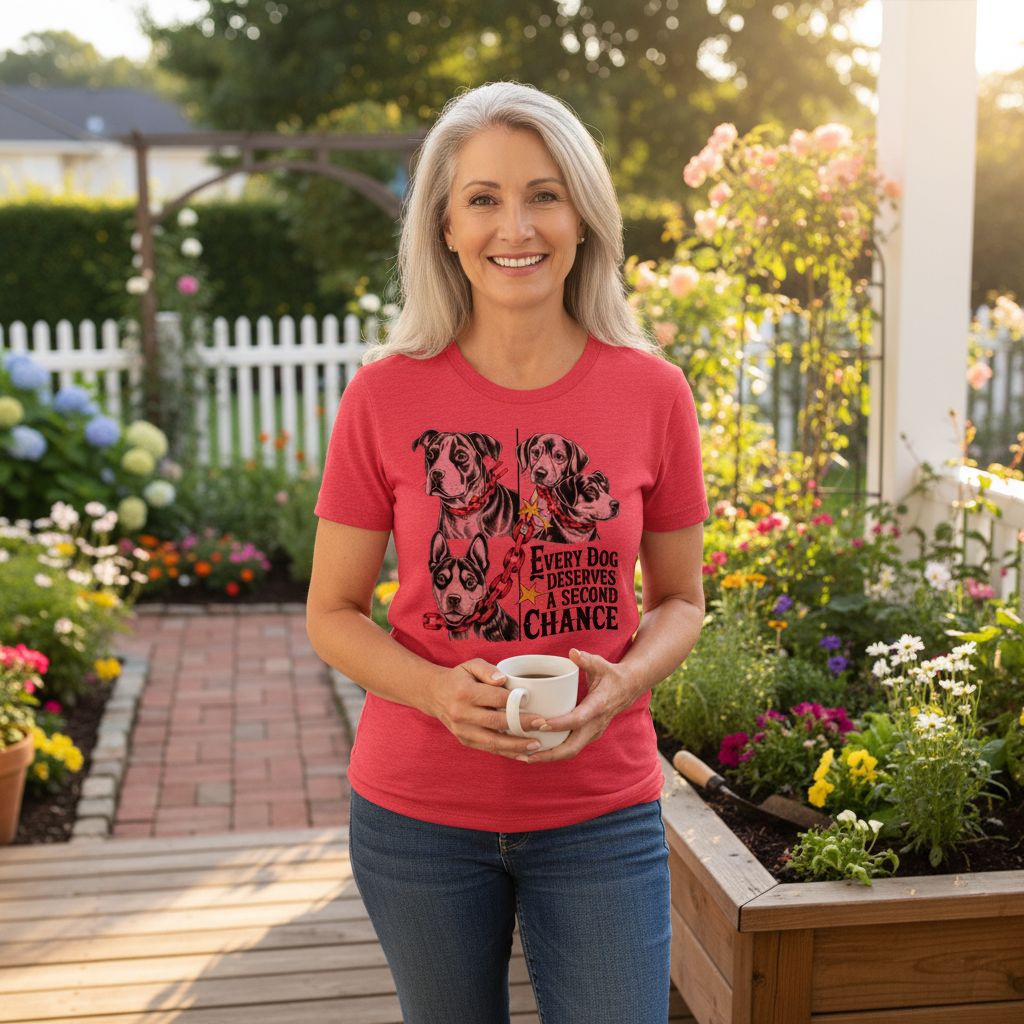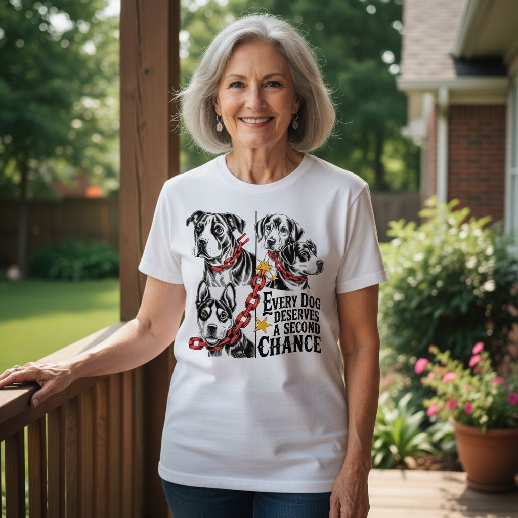 Now she wears her “Every Dog Deserves a Second Chance” tee, because healing works both ways.
