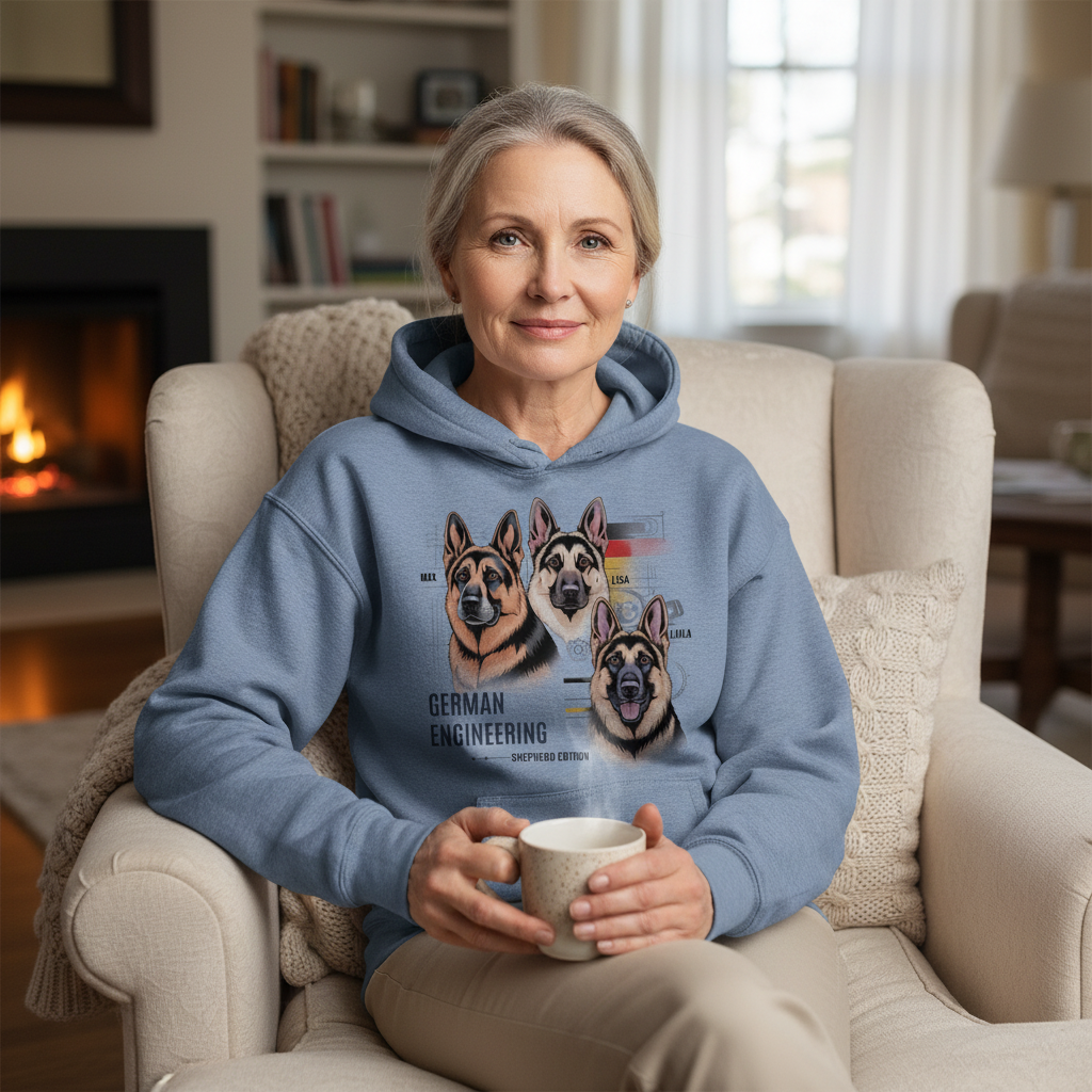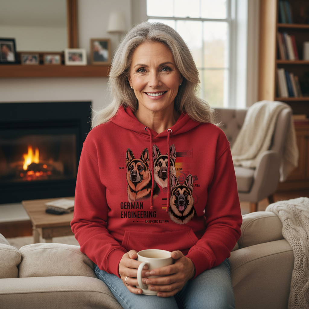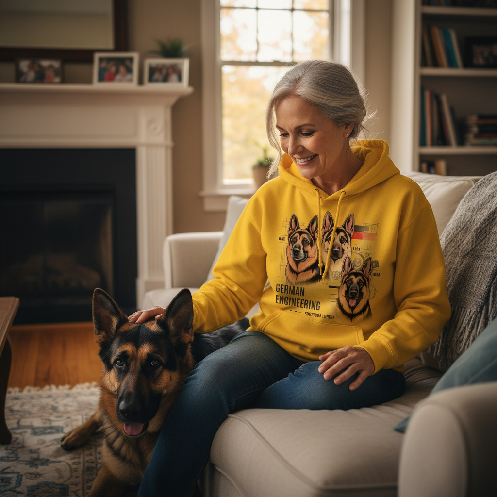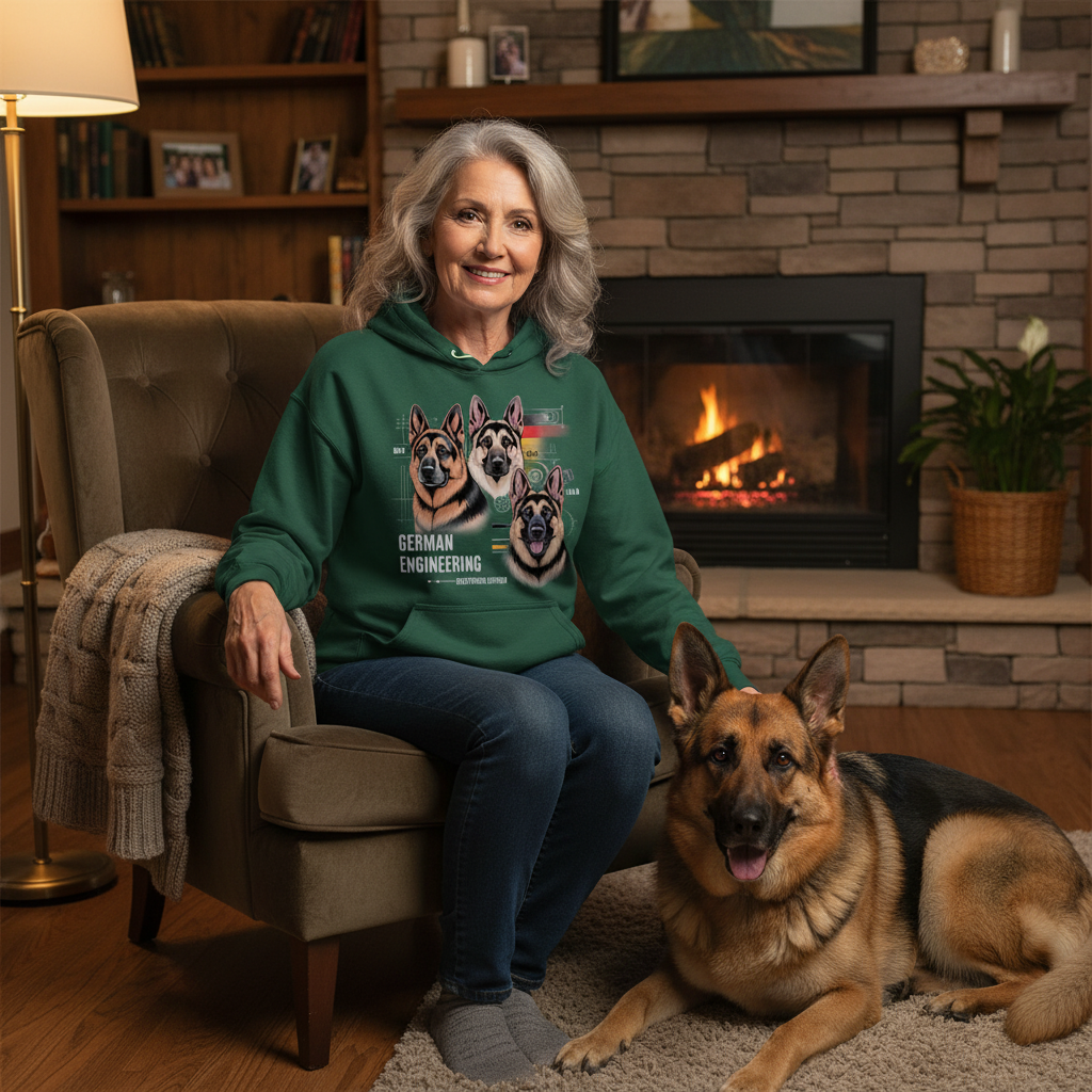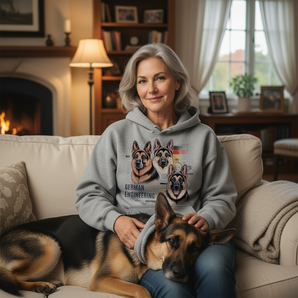 Her “German Engineering Shepherd Edition” hoodie honors a dog built for loyalty, courage, and loving his mom above all else.