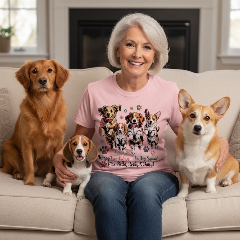 That’s why she wears her “Happy Paw-lidays – The Joy Squad” tee to honor the tails that make every holiday brighter.