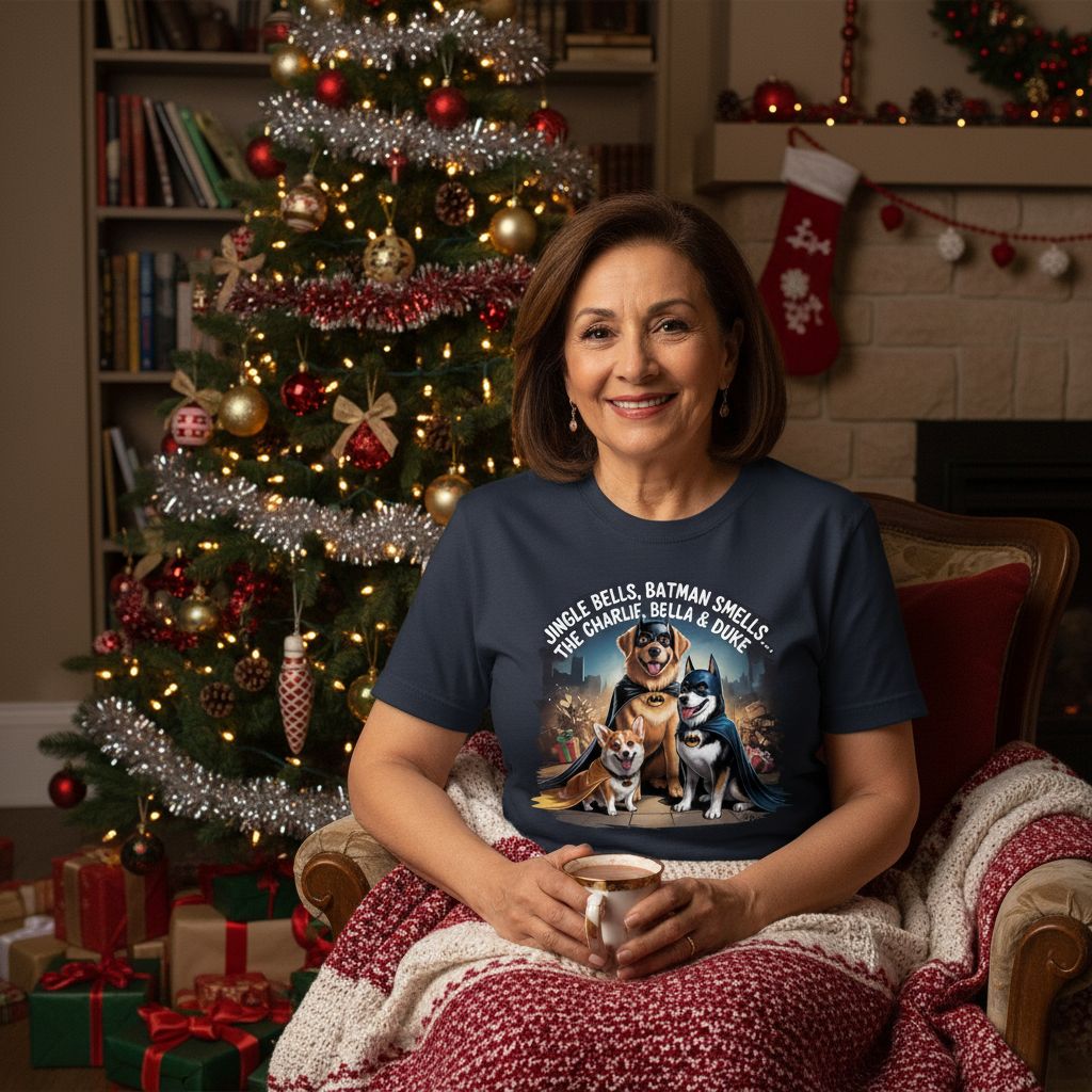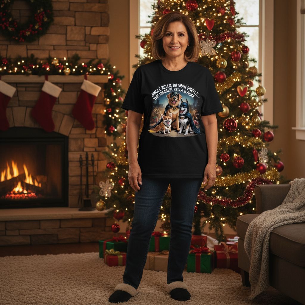 Her “Jingle Bells, Batman Smells…” tee is her badge of honor for surviving holiday dog madness.
