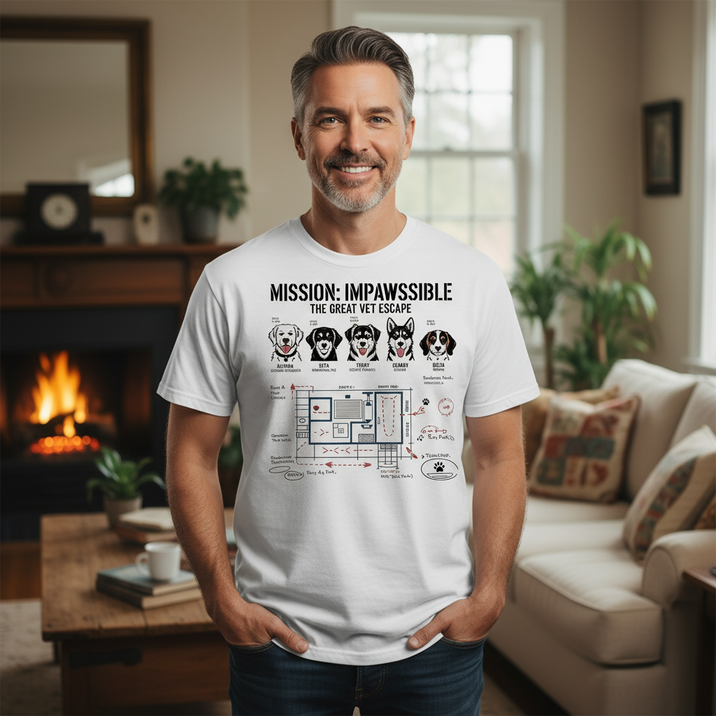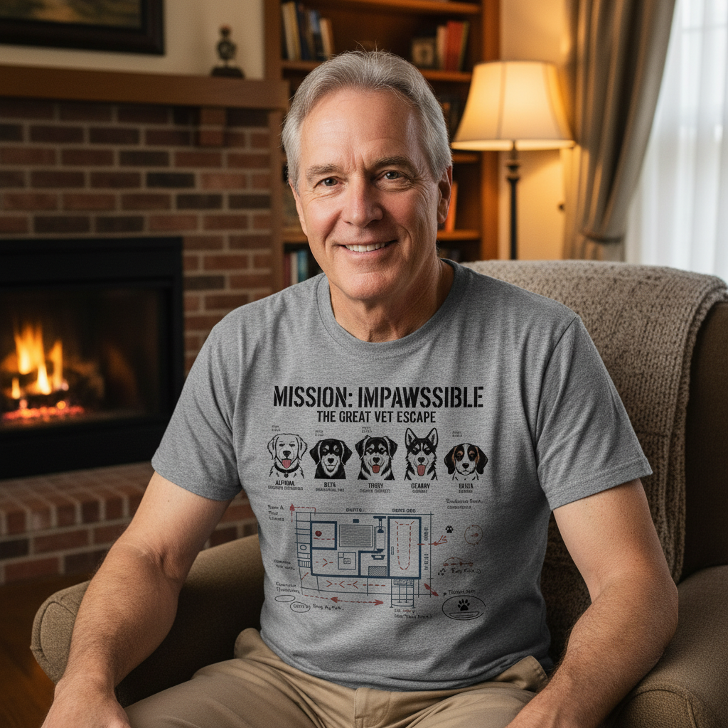 His “Mission: Impawssible – The Great Vet Escape” tee captures the truth: he’s just the handler in a spy movie starring his dog.