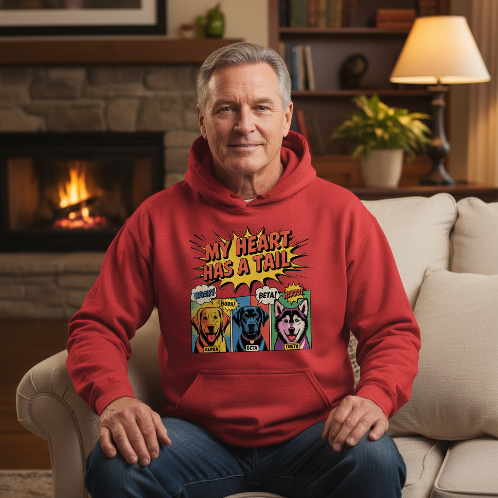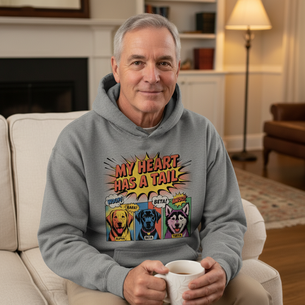 His “My Heart Has a Tail” hoodie is a quiet truth: his heart doesn’t just beat, it wags.